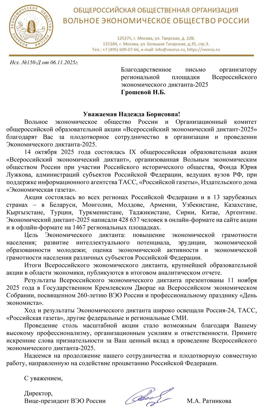 Благодарственное письмо директору БМБШ ИГУ Надежде Борисовне Грошевой - организатору региональной площадки Всероссийского экономического диктанта-2025 - по итогам общероссийской образовательной акции, которая состоялась 14 октября 2025 года во всех субъектах Российской Федерации и 13 зарубежных странах.